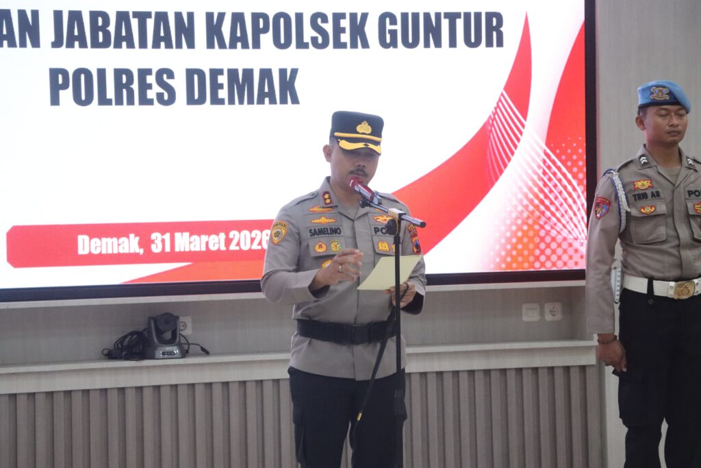 DEMAK — Suasana haru sekaligus khidmat menyelimuti Aula Wicaksana Laghawa Polres Demak, Selasa (31/3/2026). Ratusan personel berseragam rapi hadir dalam upacara penyerahan jabatan Kapolsek Guntur sekaligus purna bakti Kompol Muhammad Idzhar. Upacara yang dipimpin langsung Kapolres Demak AKBP Arrizal Samelino Gandasaputra ini menjadi momen penghormatan tertinggi atas dedikasi selama kurang lebih tiga tahun lima bulan menjabat.