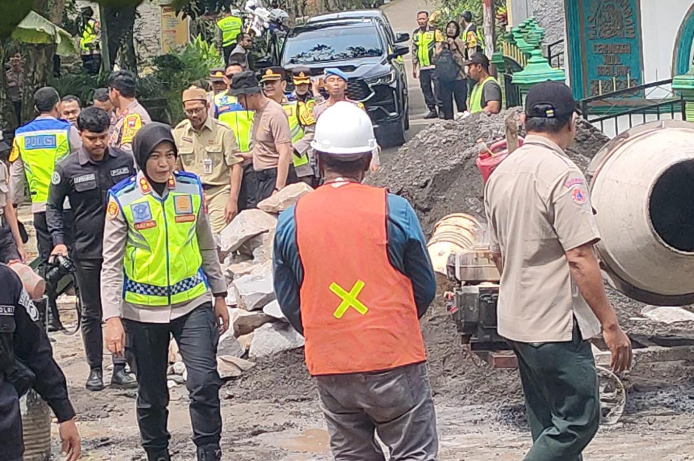 Nampak Personel Polres Semarang bersama warga dan instansi terkait bahu-membahu membersihkan material longsoran, memperkuat pondasi penyangga, dan membantu proses pengecoran struktur jembatan.