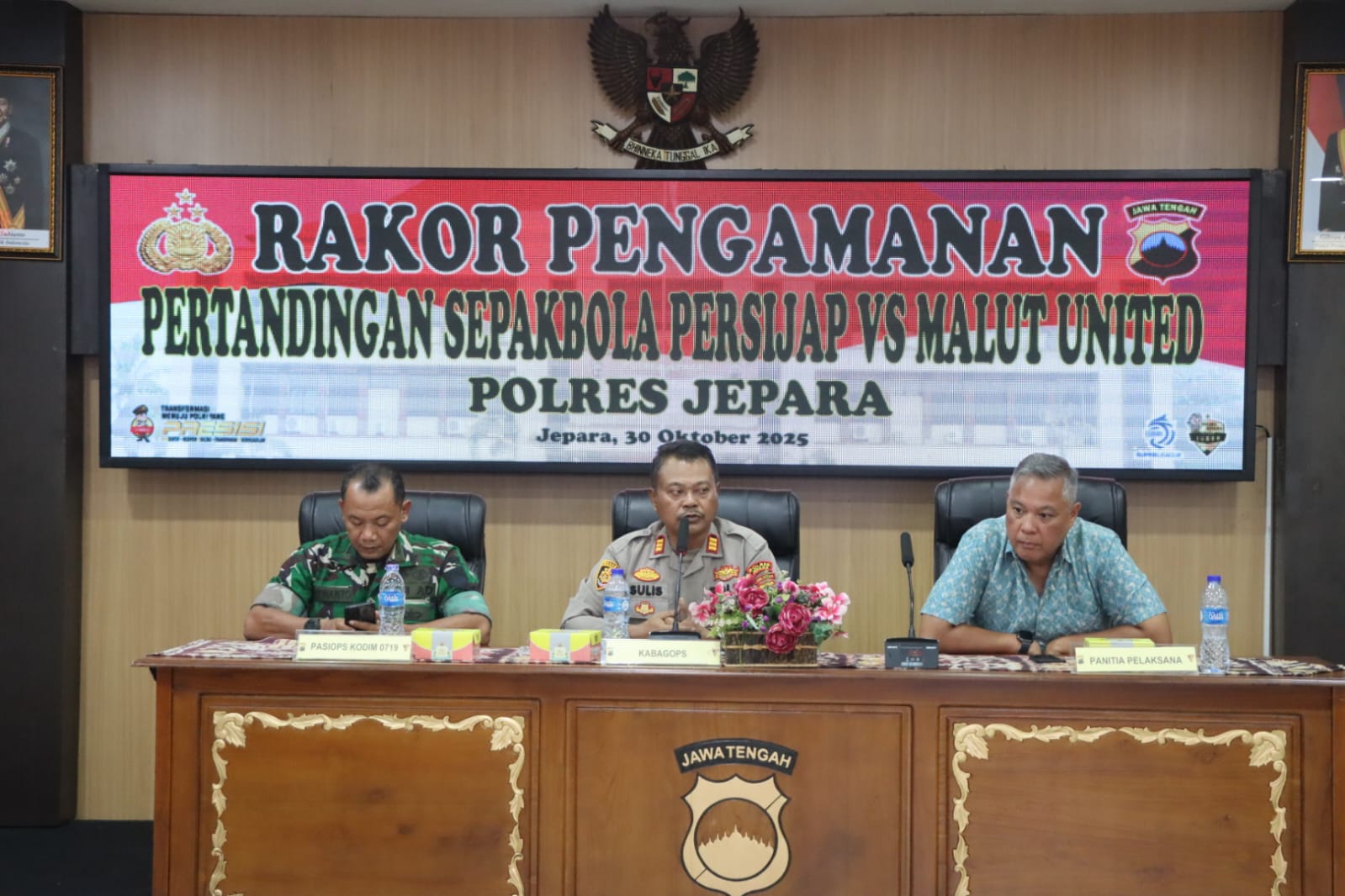 Jepara – Polres Jepara | Menjelang pertandingan Persijap Jepara menghadapi Malut United dalam lanjutan pekan ke-10 BRI Super League musim 2025/2026, Kepolisian Resor (Polres) Jepara, Polda Jawa Tengah, menggelar rapat koordinasi lintas sektor di aula Mapolres setempat, pada Kamis (30/10/2025).
