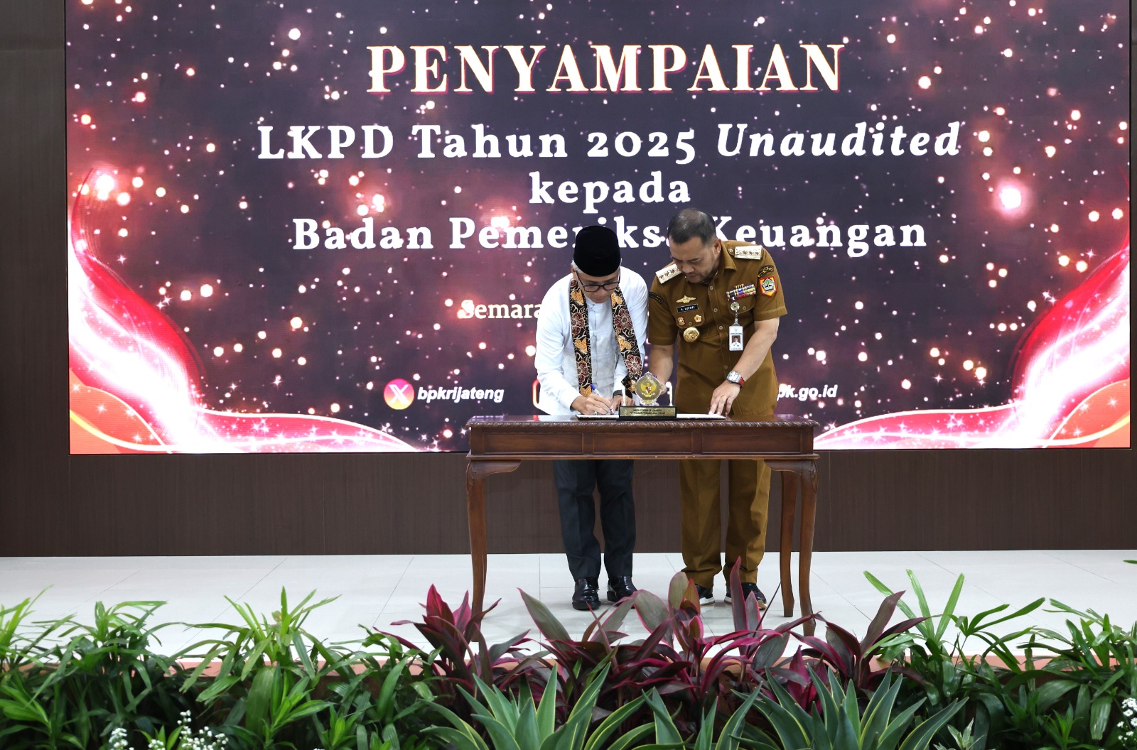 SEMARANG – Badan Pemeriksa Keuangan (BPK) Perwakilan Provinsi Jawa Tengah menerima secara serentak Laporan Keuangan Pemerintah Daerah (LKPD) Tahun 2025 Unaudited dari 36 pemerintah daerah se-Jateng, Senin (30/3/26). Bertempat di Auditorium BPK Jateng, penyerahan yang dilakukan Gubernur Jateng Komjen Pol (Purn.) Drs. Ahmad Luthfi bersama para kepala daerah ini menjadi langkah awal dari proses pemeriksaan yang akan menentukan opini atas pengelolaan keuangan daerah.